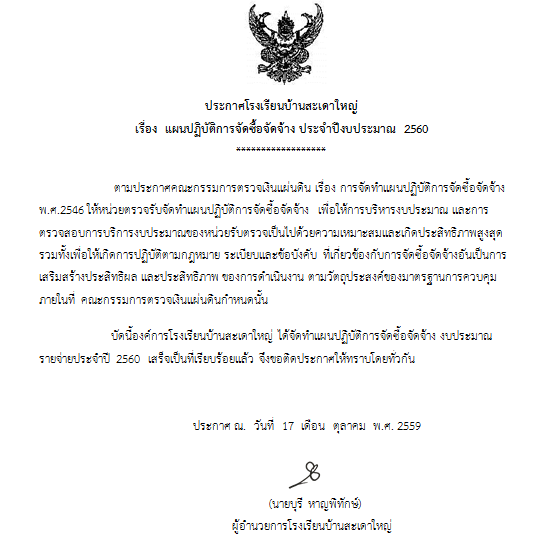 แผนปฏิบัติการจัดซื้้อจัดจ้างโรงเรียนบ้านสะเดาใหญ่ ปีงบประมาณ 2560