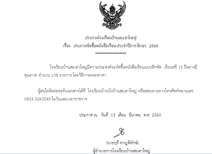 ประกาศการจัดซื้อหนังสือเรียนปี 2560